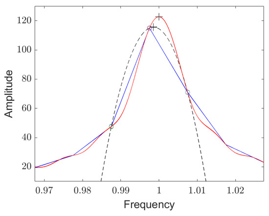 Based on this improved estimate for the resonance frequency, we can now use the discrete Fourier transformation in Equation (A52) to calculate the two Fourier coefficients half a step size from the improved estimate to the left and right