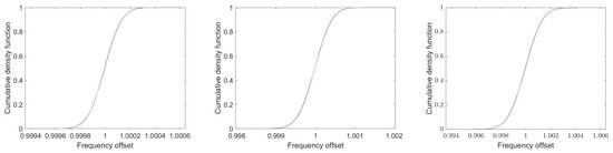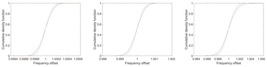 with being the real part of x. Appendix A shows the calculation of the Fisher information matrix for the parameters in as well as its inverse matrix. The asymptotic Crámer–Rao lower bounds for the unknown parameters in are obtained from the main diagonal of . We obtain (see Equations (A37) and (A38)).