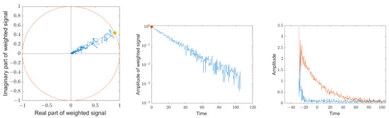 In the first sum of Equation (A41), analogous to a matched filter, we weight each measuring point with the amplitude of the decaying resonator and turn out the carrier frequency. Then, we rotate out the initial phase. If the parameters in are optimally chosen, the measuring points are then Gaussian distributed along the real axis.