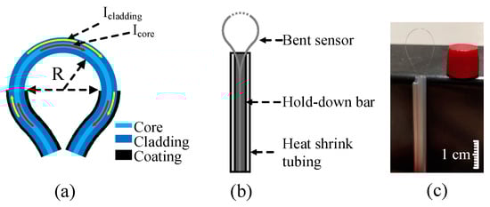 Figure 2 illustrates the structural and fabrication details of the balloon-like interferometer and the real sensor used in our experiment. In Figure 2a, the displacement sensor consists of a bare standard single-mode fiber (SMF) with a fixed bending diameter. The bending radius of the balloon-shaped section is defined as R. When light transmits through the bending section, the bending radius is so small that a portion of the core mode is coupled into the cladding and then re-coupled back into the core, creating an interferometer due to the differences in effective refractive indices (RIs) between the core and cladding modes.