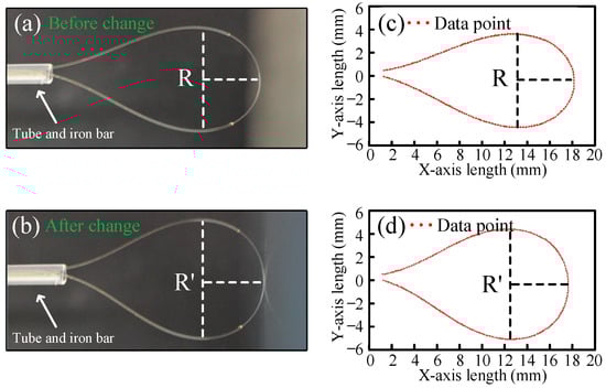 The schematic diagram of the radius variation of the displacement sensor. (a) No displacement. (b) After displacement. (c) Data point for curvature radius fitting without displacement. (d) Data point for radius curvature fitting after displacement. R, the initial radius; R’, the radius after the change.