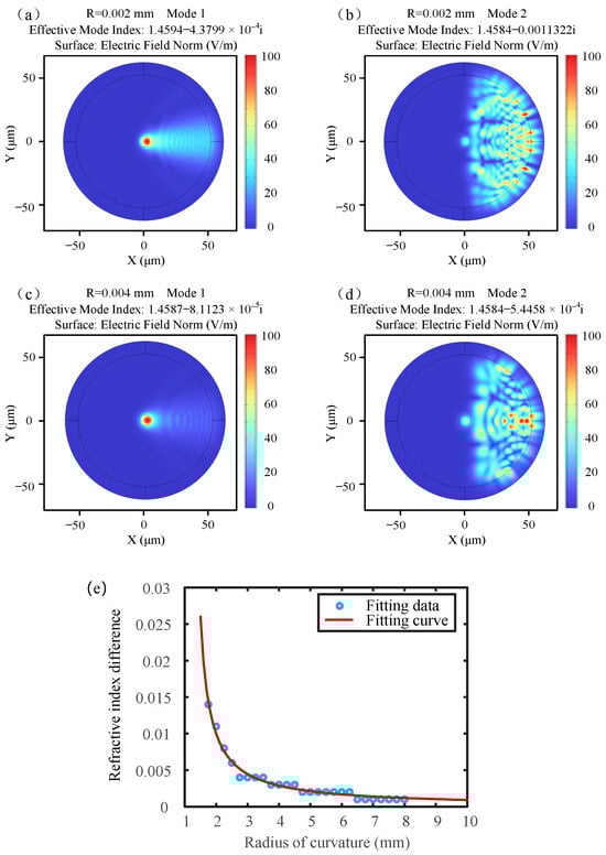 Analysis of the effective refractive index for different curvature radii. (a) Mode 1 at a radius of 2 mm; (b) Mode 2 at a radius of 2 mm; (c) Mode 1 at a radius of 4 mm; (d) Mode 2 at a radius of 4 mm; (e) Fitting curve of the refractive index difference as a function of the radius.