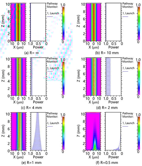 Waveguide simulation of different bending radii. (a) R = ∞; (b) R = 10 mm; (c) R = 4 mm; (d) R = 2 mm; (e) R = 1 mm; (f) R = 0.5 mm.