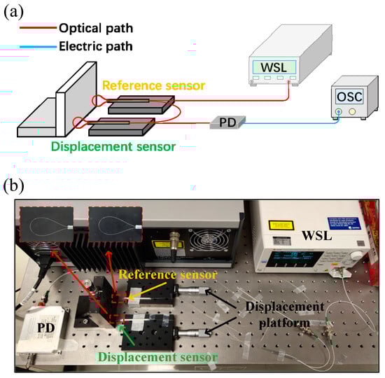 where represent the change in time difference after displacement is applied to the sensing sensor, and denotes the value of the displacement change. In this way, the wavelength change is successfully mapped to the time-domain variation. According to actual application scenarios and measurement requirements, the sensing system can adjust its sensitivity and scanning speed by replacing the WSL light source with different scanning speeds.
