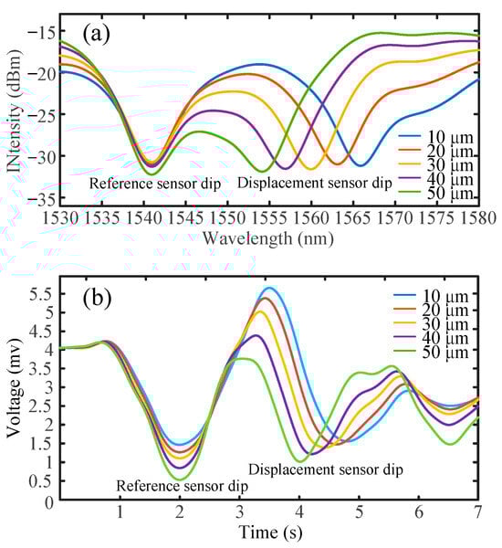 Figure 7a shows the optical spectrum of the reference sensor and the displacement sensor tested at a displacement step of 10 μm. It is evident that the reference sensor dip remains stable, while the displacement sensor dip consistently shifts towards the reference dip at regular intervals. Figure 7b illustrates the time–voltage relationship on the oscilloscope at a forward sweeping speed of 20 nm/s, with a sweeping range from 1500 nm to 1600 nm. Additionally, the sweeping range in our WSL displacement sensing system spans from 1500 nm to 1600 nm and then returns to the starting point (1600 nm to 1500 nm) within one period. Notably, the backward sweep is spontaneous for the WSL system used in the experiment. As a result, the speed of the backward sweep is fixed and cannot be reconfigured. Moreover, the backward sweeping speed is observed to be faster than that of the forward sweep, while the sweeping range remains unchanged. The backward sweeping data are utilized to demodulate the displacement sensing information, as shown in Figure 8.