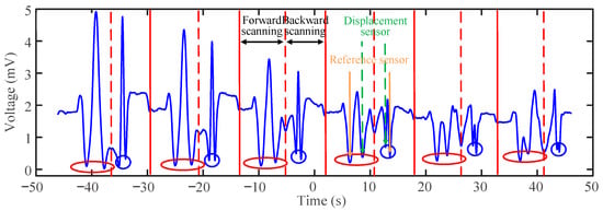 We utilize the WSL system to measure the displacement variations with a step size of 20 μm. The measurement is performed by adjusting the displacement of the platform during the scanning gap time of the WSL. Figure 8 shows the waveform that appeared on the oscilloscope when the step size of 20 μm was continuously measured over six periods, with a displacement range from 20 to 120 μm. Each period consists of two measurement processes: one for forward scanning and one for backward scanning. This configuration enables data collection twice within a single sweeping period, providing enhanced analysis compared to OSA-based demodulation methods. In Figure 8, the solid red line marks the end of each period, while the dashed red line indicates the division between positive and negative scanning. The waveform dips generated by the reference sensors remain constant and serve as reference points for data analysis. The two waveform dips generated by the displacement sensors in the middle gradually shift towards each reference dip as the displacement platform moves. The forward scanning sensing dips are enclosed within the red elliptical curve, while the reverse scanning sensing dips are enclosed within the blue circular curve. From Figure 8, it is observed that as the displacement increases, the interval between the dips gradually decreases. The oscilloscope is used to collect these data for analysis and processing, ultimately creating the displacement–time fitting diagrams shown in Figure 9a,b.