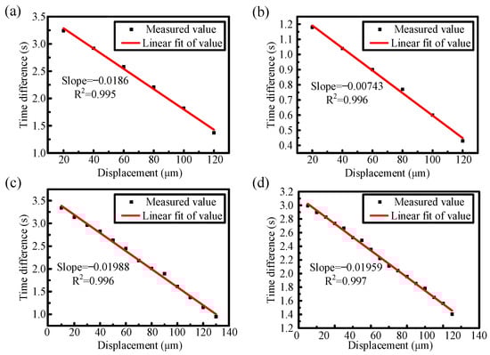 Linear fitting results of displacement measurements under different scanning processes. (a) Forward scanning process with a step size of 20 μm (b) Backward scanning process with a step size of 20 μm. (c) Forward scanning process with a step size of 10 μm. (d) Forward scanning process with a step size of 5 μm.