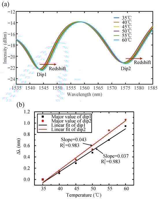 The temperature effect on the displacement sensing system. (a) Transmission spectrum of the cascaded balloon-like bending sensor from 35 °C to 60 °C. (b) Linear fit of Dip1 and Dip2.