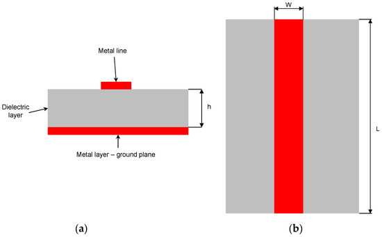 Construction of the microstrip line: (a) cross-sectional view; and (b) top view.