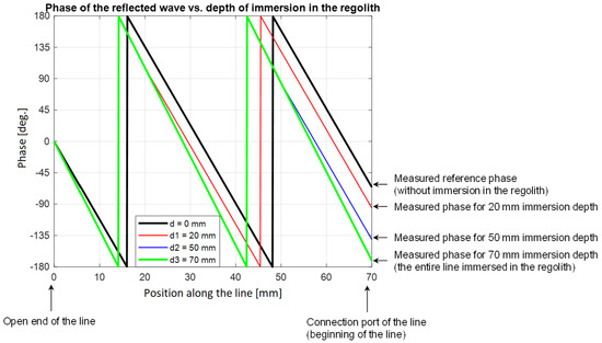 Immersion of the line in the regolith (in general, in a dielectric material with electric permittivity higher than that of air/vacuum) changes the parameters of the waves propagating in the line, which translates into a phase change of the reflected wave. The phase change is proportional to the immersion depth of the line into the regolith and the frequency of the EM wave. Figure 6 presents the phase of the reflected wave propagating in the line in dependence on the immersion depth of the line in the regolith (for a frequency of 5 GHz and a line length of 70 mm). The arrows on the right show the values of the phase measured at the beginning of the line (port connecting the line to the electronic module). The phase change also depends on the permittivity of the material in which the line is immersed.