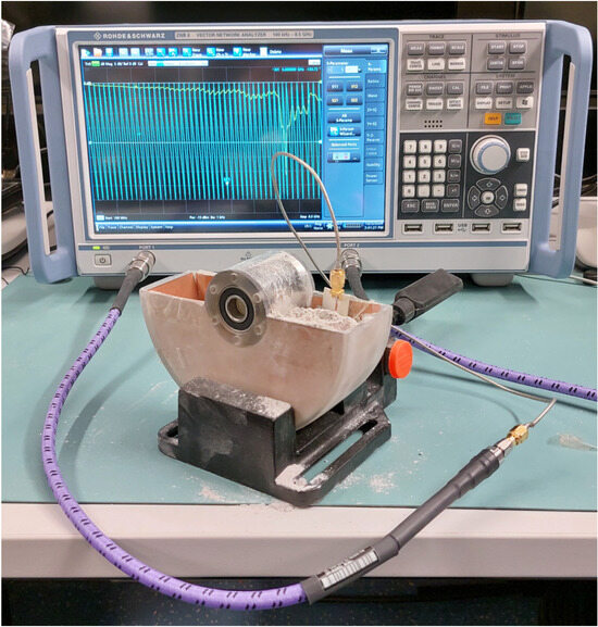 The measurement setup is presented in Figure 15. The vector network analyzer RS ZNB 8 was used to determine the phase of the reflected wave propagated in the microstrip line (reflection coefficient S11) glued to the inner wall of the shovel. Each measurement consisted of two parts, allowing for determination of the phase change caused by the presence of regolith inside the shovel: