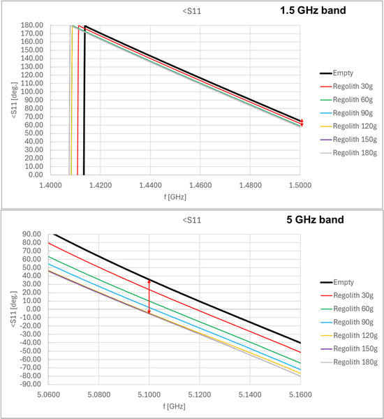Example results of the preliminary measurements for the microstrip line as the RF sensor: phase of the reflected wave (coefficient S11 of the scattering matrix) as a function of the amount of regolith inside the shovel for the 1.5 GHz and 5 GHz RF signal bands (red arrows show the range of the phase change in each band, depending of the regolith mass).