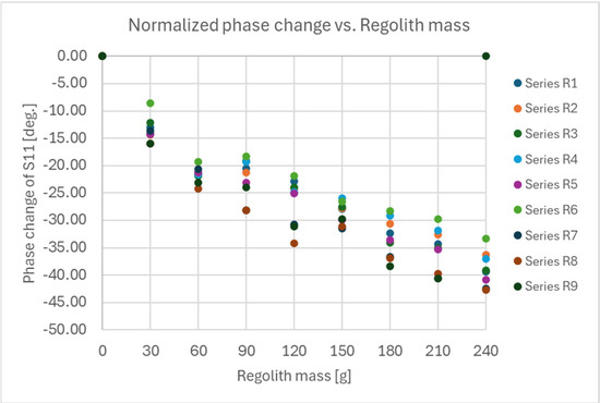 Results of the measurements of the reflection coefficient S11 phase for Series R—regolith smoothed in the shovel (for 5 GHz RF signal frequency).