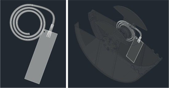 The preliminary planned location of the sensor’s electronic module is marked in Figure 3. If the antenna is used as the RF sensor, it will be permanently attached to the electronic module. However, in the case of the microstrip line, which will be mounted on the inner side of the shovel wall and will move with it during regolith acquisition, it is necessary to ensure a connection between the line and the electronic module using a coaxial cable. The length of this cable and its routing must maintain the connection for all the positions of the shovel while minimizing the impact of position changes on the measurement results.