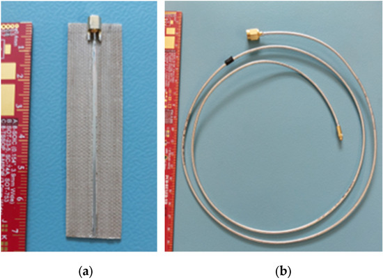 RF sensor elements: (a) microstrip line as the RF sensor; and (b) coaxial cable to connect the RF sensor to the electronic module.