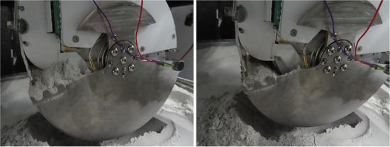The shovel was designed to enclose the entire mechanism to allow for a maximum possible footprint and thus maximize the trenching capability of the RCE. It has a cylindrical shape with a 166 mm diameter, enabling a depth of approximately 40 mm per single cut. The shovel is made of titanium alloy to reduce its mass, and counterweights made of tungsten are attached to centralize its center of gravity (CoG) close to the axis of rotation. The shovel’s teeth were designed based on mining principles—specifically, the teeth have slightly greater thickness to reduce the need for regolith compression inside the shovel. The shovel can be equipped with an RF sensor to estimate the mass of the collected regolith and a vibration system for leveling the regolith after the acquisition operation (Figure 2).