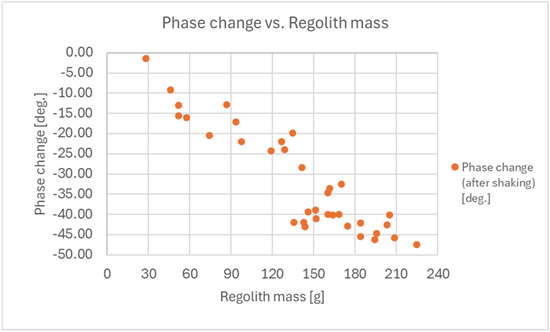 The results for all the acquisitions of the regolith without shaking (before shaking) are presented in Figure 18, which shows the dependence of the measured phase change on the weight of the regolith scooped into the shovel. Two deviations from the expected proportional relationship between the measured phase change and regolith mass can be seen in the figure: