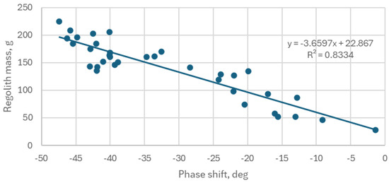 Using the collected data points, which demonstrate a correlation between the actual mass mass_r of the sampled regolith and the measured phase shift, a linear regression estimating the regolith sample mass mass_e was derived using the least squares method.