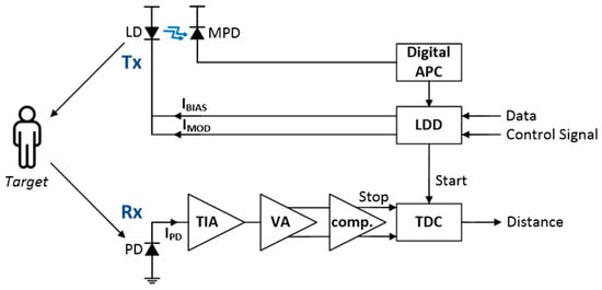 Figure 1 depicts the block diagram of a typical LiDAR sensor [6,7], where the Tx primarily consists of a laser diode and its associated driving circuits for emitting light signals toward target objects. The Tx incorporates an automatic power control (APC) module to stabilize the output power of the employed LD, regardless of temperature variations or aging effects of the LD. Specifically, the APC monitors the laser’s output power through a feedback loop (with a monitoring photodiode or MPD) and adjusts the bias current accordingly.