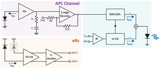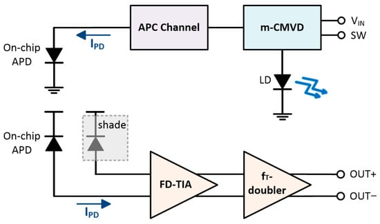 As such, in this paper, we propose a fully differential architecture utilizing two on-chip APDs. Figure 6 illustrates the block diagram of the proposed optoelectronic receiver (oRx), where the on-chip APD detects the reflected light from a target and generates an input photocurrent (ipd). Also, a dummy APD is added at the differential input node to eliminate the need for a passive capacitor, which would typically be used to electrically model the on-chip APD. This dummy APD helps to mitigate the issue of DC offset currents between the two differential outputs by utilizing a balanced architecture, thus producing symmetrical outputs. In other words, the proposed oRx architecture can eliminate the need for an offset cancelation circuit, consequently reducing the circuit complexity and chip area. The FD-TIA topology converts the input photocurrent to voltage signals and enables the generation of symmetric differential signals even without a multi-stage post-amplifier, consequently reducing power consumption further. In addition, a fT-doubler that boosts the output voltages further and matches the output resistance to 50 Ω for facilitating the measurements. Furthermore, this oRx incorporates an extra third APD that is followed by a narrow-bandwidth low-noise TIA. This specially dedicated channel is proposed for the concurrent APC operations.