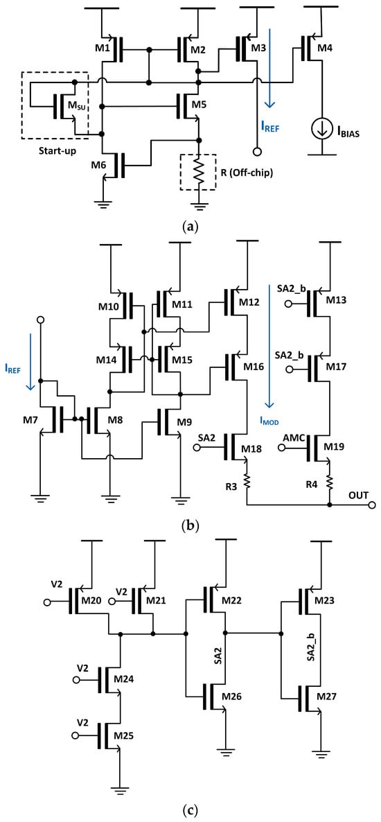 Figure 3 depicts a block diagram of the m-CMVD in Tx that integrates a wide-swing current–mirror circuit as a bias generator, thereby providing stable bias current. The m-CMVD ensures reliable and consistent optical performance. In this work, the wide-swing current mirror produces a 1 mA reference current.