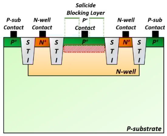 Figure 5 illustrates the cross-sectional view of the on-chip P+/N-well (P+/NW) APD that shares the same structure described in [13]. When off-chip APDs are utilized, signal distortions may occur because of the inevitable bond–wire inductance followed by the parasitic capacitance from the ESD protection diode. It may also cause difficulties in PCB design for testing and increase the implementation cost especially for cases of multi-channel receiver arrays. Therefore, we have eliminated these effects in this work by exploiting on-chip APDs, simultaneously offering merits such as small size, low cost, and facile design.