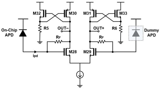 Figure 7 presents the schematic diagram of the FD-TIA. In particular, the FD-TIA features PMOS loads (M30, M31) that are cross-connected to the source-followers (M32, R5 and M33, R6). Since the gate of each source-follower (SF) is connected to the drain of the PMOS load while the source of each SF is connected to the gate of the PMOS load, the peak voltage of the drain node (OUT−) can become VDD − Vsg30 + Vgs32, thus allowing a full swing up to the supply voltage (VDD) under the assumption that the values of Vsg30 and Vgs32 are almost identical. According to small signal analysis, the transimpedance gain of the FD-TIA is given by