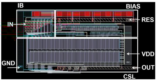 Figure 8 shows the layout of the proposed m-CMVD circuit first, where the fabricated chip occupies a core area of 0.196 mm2. Post-layout simulations using a standard 180 nm CMOS process indicate the maximum power consumption of 11 mW from a single 3.3 V supply.