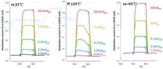 Simulated PVT variations in the m-CMVD with the combined currents of 0.1–10 mApp for a pulse-width of 5 ns: (a) TT, 27 °C, 3.3 V, (b) FF, 125 °C, 3.63 V, and (c) SS, −55 °C, 2.97 V.