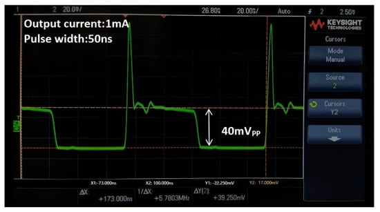 Figure 12 demonstrates the measured pulse response of the proposed m-CMVD circuit, in which the output current of 1 mA is transmitted with a pulse width of 50 ns when all the switches are turned on.