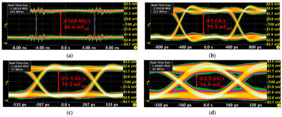 Measured eye-diagram of the proposed oRx for 290 µApp input current at different data rates of (a) 100 Mb/s, (b) 1 Gb/s, (c) 1.5 Gb/s, and (d) 2.5 Gb/s, respectively.