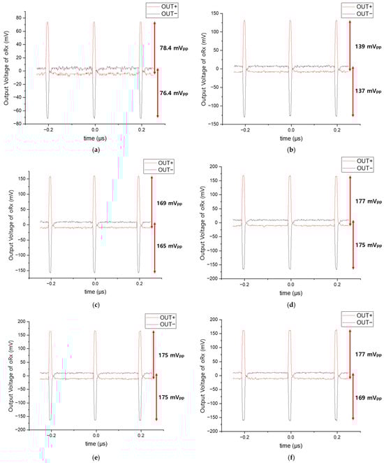 Figure 15 presents the measured pulse response of the proposed oRx with the different input currents ranging from 100 µApp to 600 µApp, where symmetric and stable differential outputs are observed at the output nodes, i.e., OUT+ and OUT−, which is attributed to the proposed FD-TIA configuration equipped with a dummy APD.