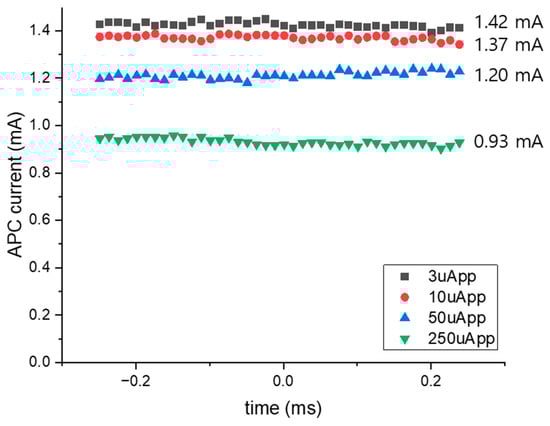 Figure 16 demonstrates the measured bias current of the APC channel, when the decreasing input current is detected in the range between 3–250 µApp. Then, it is clearly observed that the DC level increases as the detected strength of the input signal decreases. These results indicate that the APC channel can effectively compensate for the variation in the bias current when the Tx provides the degraded bias current, thus confirming the potential of the proposed APC mechanism.