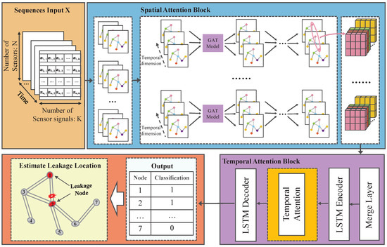 X from all sensors is embedded within this graph structure. After partitioning the data into batches, the graph representation is fed into the spatial attention module, where the graph attention mechanism identifies pertinent information across the pipelines in the network’s topology. Subsequently, the data are reformatted to reflect the temporal dimension, enabling the capture of temporal dynamics. These reformatted data are then introduced to the temporal attention module. Within this module, the data undergo encoding and decoding using Long Short-Term Memory (LSTM) networks, with the temporal dependencies effectively captured through the application of the temporal attention mechanism.