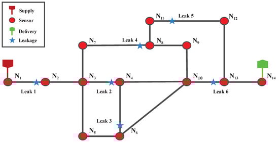 Figure 3 presents the topology of the simulated natural gas pipeline network, which consists of 14 nodes and 17 pipes. These nodes represent sensors commonly deployed in real-world gas pipeline systems, each of which monitors pressure and flow signals within the network. The pipeline specifications include an inner diameter of 482.6 mm and a wall thickness of 12.7 mm. A detailed list of the input parameters is provided in