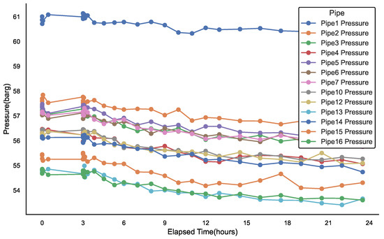 In contrast to the localized impact on flow, the pressure changes within the same area follow a more consistent trajectory. While leakage strongly influences local flow variations, the pressure data seem to reflect the response of the entire pipeline system, with pressure changes exhibiting a more uniform pattern. This suggests that, although pressure changes are relatively consistent, their response at different pipeline nodes may be influenced by additional factors, such as the pipeline material, distance from the leakage point, and the overall load on the pipeline system.