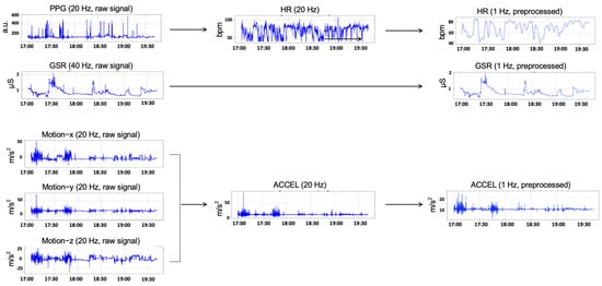We performed the following calculation and preprocessing operations on the multi-modal signals. Figure 1 shows a flow chart of the raw signal and the preprocessed signal for the HR, GSR, and ACCEL signals.