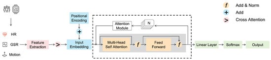 The Transformer is a model architecture that exclusively utilizes an attention mechanism to establish the global interdependence between input and output. Like most sequence-to-sequence models, Transformer is also an encoder–decoder architecture. However, as physiological recording signals do not have a standard translation, we only use the encoder part. Figure 2 shows the detailed technological process of our Transformer model. The fused input embeddings are passed through a series of Transformer encoder layers, where each layer includes multi-head self-attention and feed-forward layers. The purpose of this module is to learn complex temporal and cross-modal dependencies that contribute to affective state classification. The output from the multi-head attention module undergoes processing by a feed-forward network.