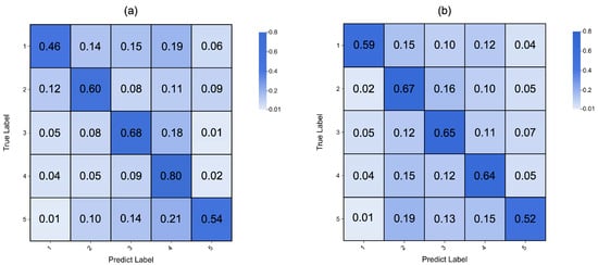 The confusion matrices presented in Figure 3 illustrate the classification performance for valence and arousal across the five classes. The horizontal axis represents the predicted labels, the vertical axis represents the true labels, and the number in each cell represents the proportion of each true label being classified into the different categories. In both matrices, diagonal numbers indicate that the model accurately predicted the true label. For the valence classification, which is shown in Figure 3a, and the arousal dimension, which is shown in Figure 3b, a similar trend is observed, but there was still confusion between some adjacent categories. This suggests that the model could capture the general feature of affective states.
