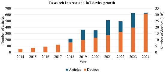 The topic of robotics and the Internet of Things (IoT) has gained significant traction in the academic community, as evidenced by a steady increase in scholarly publications over recent years. This upward trend reflects the growing interest in and importance of these technologies, both in theoretical research and practical applications. Researchers are exploring diverse areas such as machine learning integration, autonomous systems, and IoT-enabled robotics, leading to a surge in papers that address innovative methodologies, case studies, and emerging challenges. The consistent rise in academic output underscores the relevance and urgency of these fields, indicating that robotics and IoT are not just pivotal research areas but also key drivers of future technological progress and interdisciplinary collaboration. In the Figure 1, we present data demonstrating the stable growth of both IoT device deployments and scientific interest in this domain. This figure is based on data from Scopus, reflecting academic publications, and from IoT Analytics, providing insights into the growth of connected devices. To obtain the data, two keywords—IoT and Robot—were used in the Scopus search to include as many articles as possible that combine these two areas. Articles with no significant narrative value or articles that do not address the issue were then excluded from the list, and a total of 3409 articles from 2014 were included in the survey. The combined data sources clearly illustrate the parallel expansion of the IoT landscape in both practical implementation and scholarly investigation. The survey, based on the number of publications registered each year in Scopus, further reinforces this observation.