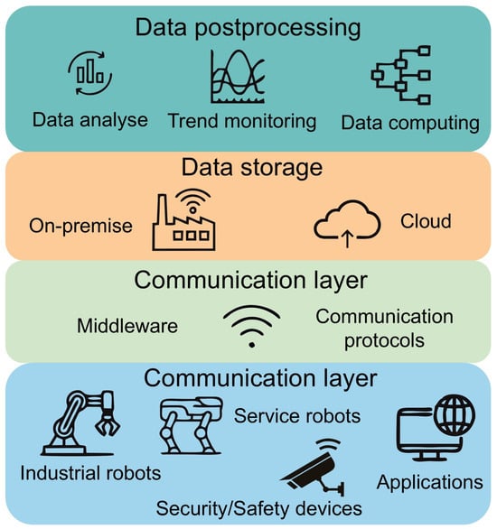 The Internet of Robotic Things (IoRT) is one of several branches of the Internet of Things (IoT), utilizing advancements in smart sensors, communication technologies, and internet protocols [1], as well as technologies like wireless sensor networks and cloud computing [2]. This is similar to the Industrial Internet of Things [3], the Internet of Medical Things for monitoring vital signs [4], smart e-Health gateways [5], telemedicine platforms [6], the Internet of Agricultural Things for precision farming [7], food supply chain management [8], environmental monitoring [9], or the Internet of Military Things for battlefield awareness [10]. All of them are connected in some sense, from the very edge—where they collect the most accurate data directly at the source, the so-called “Edge” [11]—through the Internet fog [12], which is made up of millions of paths consisting of different communication protocols, referred to in [13], to a central system where computation is performed, mostly a cloud platform [14]. All these sectors together form a global system called the Internet of Everything [15]. The name IoRT already implies that it is an application of IoT on robotic systems. The field of robotics is itself a very dynamic field in terms of development and implementation. IoT in this field, therefore, serves to make the individual systems even more efficient, and thus completes the modern notion of autonomous robots [16] and intelligent manufacturing systems [17] that complete the picture of smart factories and industry 4.0 [18]. It is widely acknowledged that the benefits of IoT in individual industries are large, and these systems are expected to spread to other areas as well, though the basis is very similar for all areas.