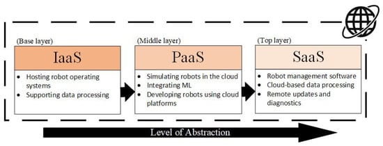 “As-a-Service” models, including Infrastructure as a Service (IaaS), Platform as a Service (PaaS), and Software as a Service (SaaS), provide a cloud-based framework that simplifies the development, deployment, and management of robotics and IoT applications. These models enable robotics and IoT systems to leverage scalable computing power, specialized development tools, and comprehensive software services without needing to manage underlying hardware or software complexities. In robotics, IaaS offers the computational resources required for tasks like simulation and data processing, while PaaS provides a development environment to build and test robotic applications integrated with IoT devices. SaaS facilitates real-time monitoring, fleet management, and analytics by offering end-user applications that communicate with both robots and IoT devices. In addition to the basic “As-a-Service” model described above, we can also find a number of other models. These include Function as a Service (FaaS), Data as a Service (DaaS), and Artificial Intelligence as a Service (AIaaS). FaaS enables the execution of small pieces of code in response to events without server management, with billing based only on runtime, making it a scalable and cost-effective solution. DaaS provides data on demand via the internet, with centralized management and scalability, and is commonly used for market analysis, IoT, or customer insights. AIaaS offers access to AI tools like machine learning and natural language processing without the need for in-house development, allowing businesses to easily integrate AI into their operations. By combining “As-a-Service” models with IoT, robotics systems can achieve seamless connectivity, remote control, and data-driven insights, leading to more intelligent, efficient, and scalable robotic solutions that operate autonomously and interact dynamically with their environments [89].