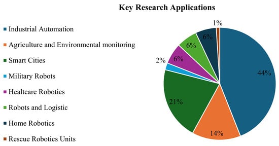 This section focuses on key applications where IoT and robotics intersect, describing their use across various industries such as industrial automation, healthcare robotics, agriculture, and logistics. For each sector, we will present specific examples of how IoT and robotics enhance efficiency, precision, and automation capabilities. Based on publication statistics from Scopus, which we describe in Section 2, and with the addition of keywords for each application area, we constructed a pie chart describing the research interest for each sector, as shown in Figure 6. Additionally, the section provides an overview of the current state of the art in these applications, highlighting recent scientific advancements and technological innovations, while addressing the challenges and opportunities that lie ahead for the development of these solutions.