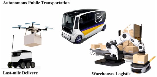 One of the main applications is autonomous transport [114], where robotic vehicles equipped with sensors and IoT systems enable safe and efficient movement around the city, including autonomous cars, buses, and drones for transporting goods or monitoring infrastructure [115]. One example is delivery services using robotic systems for last-mile delivery [116]. There are also applications such as smart lighting and energy systems, where smart systems and robots monitor energy consumption, which can be used for smart lighting on highways [117] or in public spaces. Similar applications can be found in all common experiences, such as the use of occupancy sensors that detect people in buildings [118] and are thus able to intelligently manage, for example, electricity consumption. In security, the combination is used for the monitoring and surveillance of public spaces, where autonomous robots and drones detect dangerous situations and support crisis intervention. Waste management is also benefiting from this technology [119], with autonomous robots monitoring the status of bins and optimizing their emptying, increasing the efficiency of waste management. Last but not least, smart buildings and infrastructure are controlled by IoT and robotics [120], enabling energy and water optimization, monitoring buildings, and performing predictive maintenance. Another interesting direction is the use of federated learning [121,122] in smart cities, where large amounts of data make it advantageous not to use centralized systems. These applications, and especially if they are supported by ML technologies [123], can make a significant contribution to creating the smart and sustainable cities of the future.