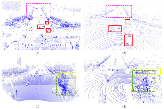 - Occlusions: Roadside LiDAR, positioned at a higher vantage point, is more prone to being obstructed by fixed objects such as buildings and trees. For instance, these structures may block roadside sensors at an intersection, limiting their ability to scan objects around corners and resulting in missing point cloud data in certain areas. As shown in Figure 1c,d, the green boxes in both the vehicle-side and roadside views illustrate that objects like trees do not obstruct the vehicle in the green box from the vehicle’s perspective, as they do in the roadside view. Consequently, the vehicle in the yellow box remains undetected due to occlusion by surrounding objects.