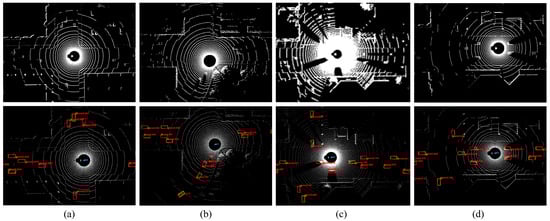 Figure 5b further demonstrates the improved model’s significant enhancements in detecting parked vehicles along the roadside and vehicles near intersections or corners. The baseline model struggles in these complex scenarios, where occlusions and a limited field of view can lead to missed or incorrect detections. By optimizing geometric feature extraction, our improved model strengthens its ability to capture and understand targets in complex environments. Particularly in corner cases or situations with heavy occlusion, the improved model can better identify parked vehicles or those hidden at the edges of the sensor’s field of view, showcasing its robustness across multi-scene and multi-angle conditions.