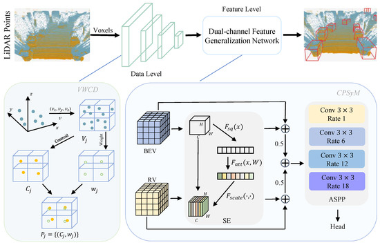 To address the differences between roadside and vehicle-mounted LiDAR point clouds, we propose the CPSyM, inspired by the VISTA model [42] and the method in [43]. This module leverages multi-view feature inputs and employs a balanced fusion approach to ensure more accurate and robust feature representation for roadside LiDAR point clouds. The balanced fusion strategy integrates features from BEV (bird’s-eye view) and RV (range view) perspectives, allowing complementary information from both views to be optimally utilized. BEV provides rich spatial context, which is essential for understanding the global layout, while RV captures fine-grained geometric details, critical for detecting small or occluded objects. This balanced fusion ensures that both feature sets contribute effectively, thus enhancing model performance and generalization capability.