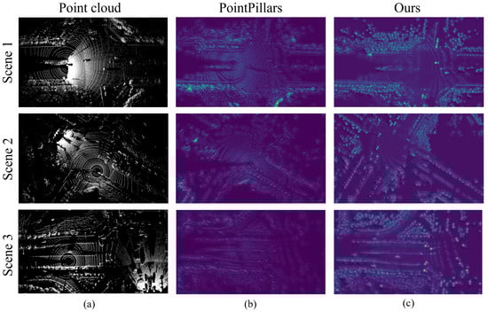 Figure 6b shows the heatmaps generated by the baseline PointPillars model. While the baseline model captures the general structure of the scene, it exhibits limitations in distinguishing critical features, especially in sparse or occluded areas. For instance, in Scene 1, the baseline model struggles to emphasize the boundaries of key obstacles and fails to capture sufficient feature intensity in critical regions, such as intersections or areas with overlapping objects. Similar shortcomings are observed in Scenes 2 and 3, where the feature activations are diffused, and the boundaries of important objects are poorly defined. These limitations stem from the baseline model’s reduced capability to adapt to varying point cloud densities and its reliance on global feature extraction methods.