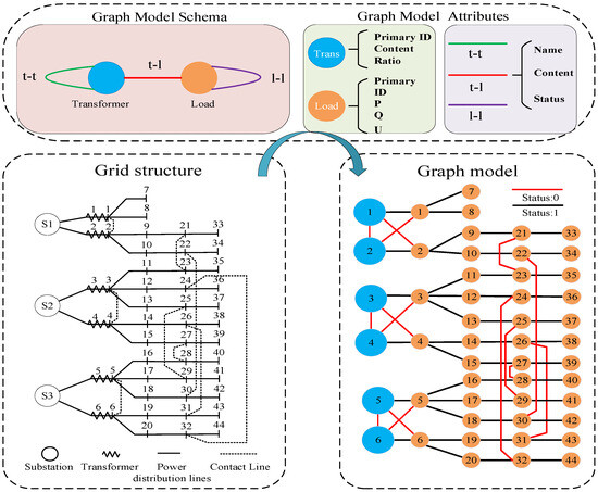 The schema defines the vertex and edge types, connection relationships, and attributes within a graph database. To ensure an accurate and comprehensive representation of the operation status of the distribution grid, the diagram model must fully consider the interconnections between various entities in the network as well as operating information pertaining to transformers and loads. Figure 1 illustrates the modeling process for constructing the distribution network diagram model.