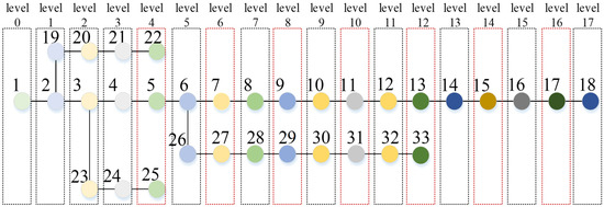 Then, each main substation in the distribution grid is modeled as a virtual load vertex, and the Start Flag attribute of its vertex is 1. The power supply level is set for all load vertices, which is called level. The level variable of the load vertex with the Start Flag attribute of 1 is assigned to 0, the neighboring load vertices are visited in parallel by the edge with the Status attribute of 1, and the level of the visited vertex is added to 1. After the level variables of all load vertices are assigned, the level variables of adjacent load vertices are compared, and if there is a load vertex i satisfying (6), its End Flag attribute is assigned to 1. Taking the IEEE 33-bus graph model as an example, the power supply levels of each load vertex are shown in Figure 2.